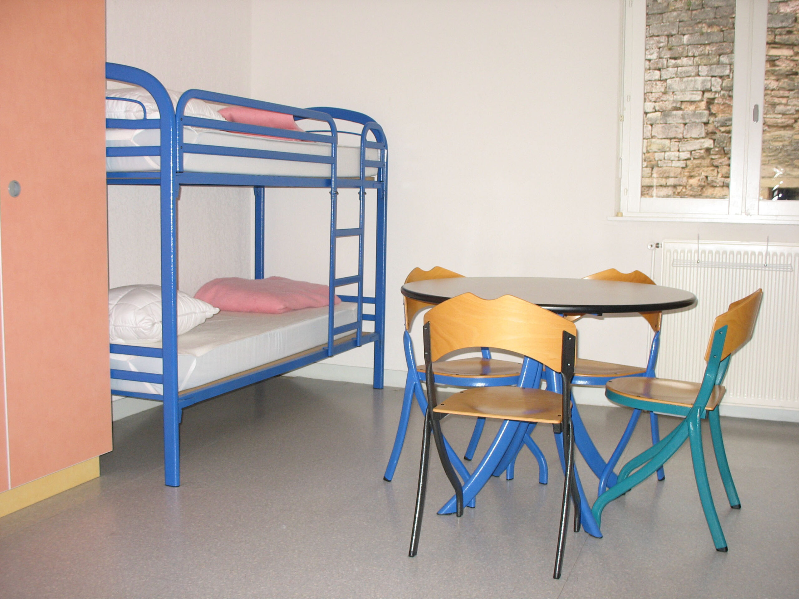 À l’étage, 20 chambres, pour l’essentiel de 4 personnes, avec bloc sanitaire commun à 2 chambres comprenant 1 WC, 1 douche et 4 lavabos. Chambres équipées de lits superposés.
